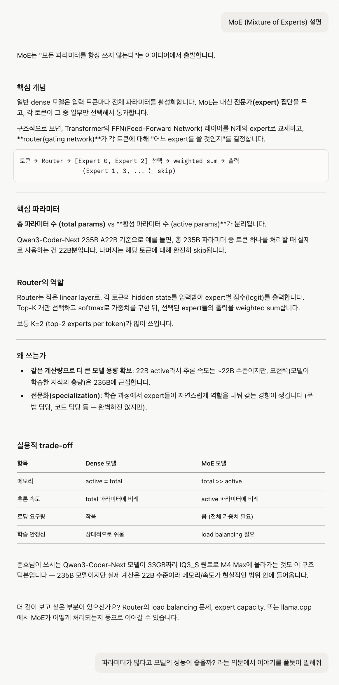 이걸 읽으면 다음 질문이 자동으로 생긴다. "전문가 네트워크가 뭐지?" → 링크를 열고. "라우터는?" → 또 링크를 열고. "토큰 임베딩은?" → 또...