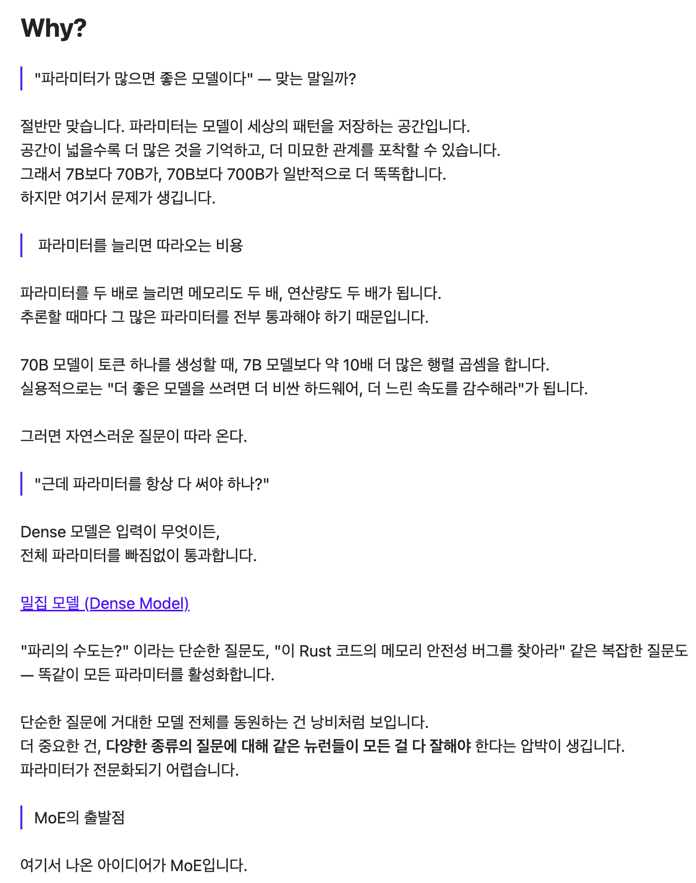 이 설명은 한 번에 읽힌다. Dense 모델을 어렴풋이라도 알고 있다면 — 그 맥락 위에서 MoE가 왜 나왔는지가 보인다. 링크를 따라가지 않아도, 정의를 암기하지 않아도.